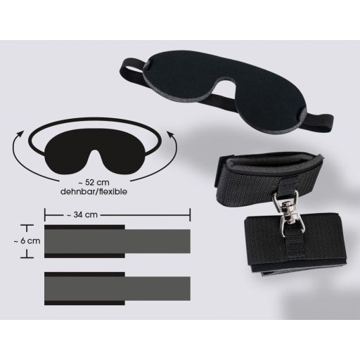 Mert egyszerre kínál kényelmes, párnázott rögzítést és izgalmas érzéki elzárást. A bilincsek 34 cm-es teljes hosszuknak és 6 cm-es szélességüknek köszönhetően stabil, de nem vágó tartást adnak, míg a forgó fémgyűrűk nem korlátozzák a természetes mozgást. A puha poliamid bevonat légies érintése nem dörzsöli a bőrt, a tépőzár pedig olyan gyorsan oldható, mint amilyen gyorsan a vágy felizzik. A szemmaszk pedig mindehhez titokzatos, érzékfokozó körítést ad.