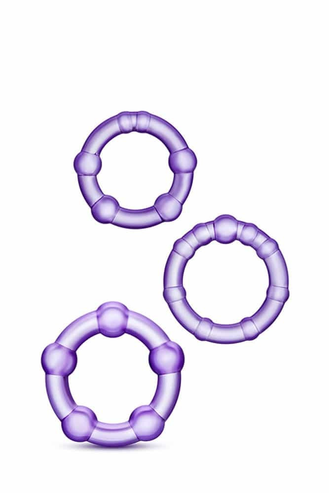 Tapasztald meg a feszes tartást és a partnerkényeztető élményt a Stay Hard Beaded Cockrings Purple szettel! A három, eltérő méretű lila péniszgyűrű rugalmas, bőrbarát TPE-ből készül, így kényelmesen illeszkedik, miközben gyöngyözött felületével extra stimulációt ad mindkettőtöknek. A 3–3,4 cm-es belső átmérők révén könnyedén megtalálod az optimális szorítást, a vízálló kivitelnek köszönhetően pedig akár zuhany alatt is bevetheted.