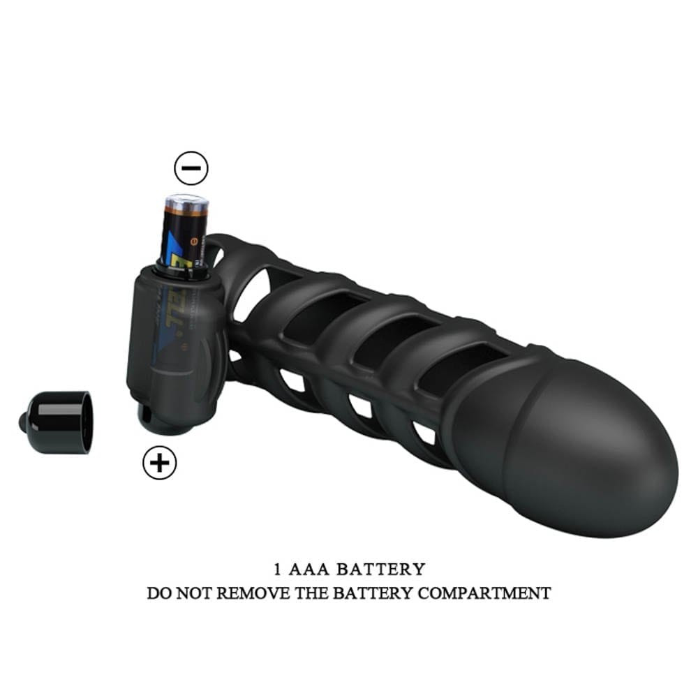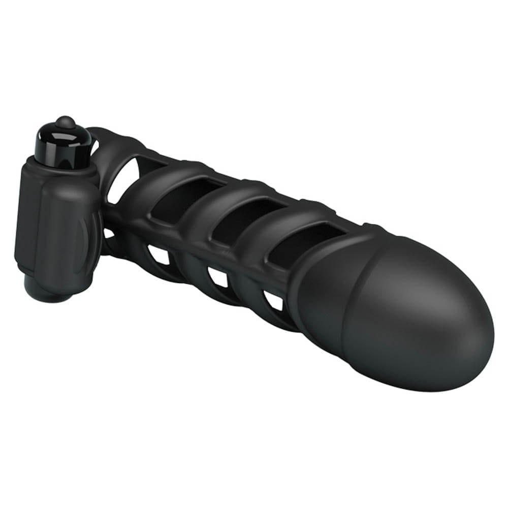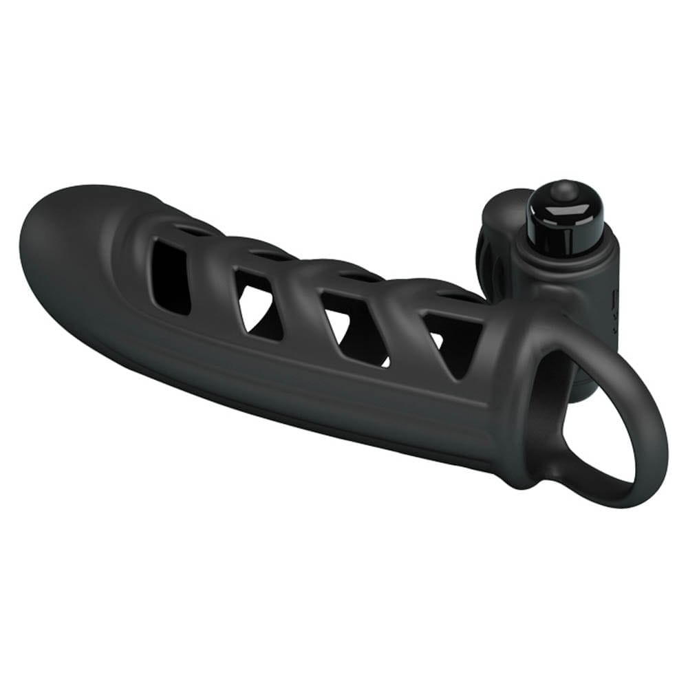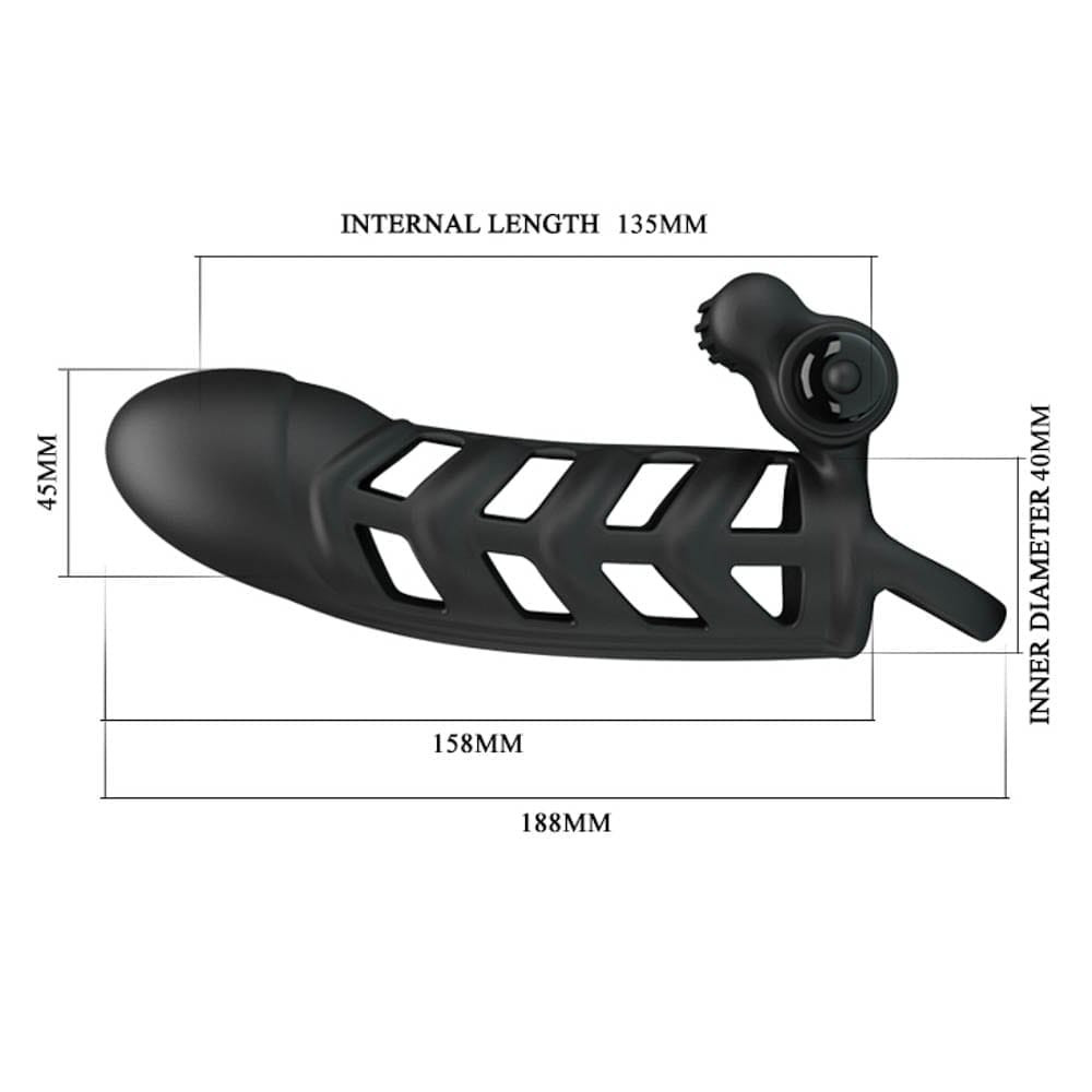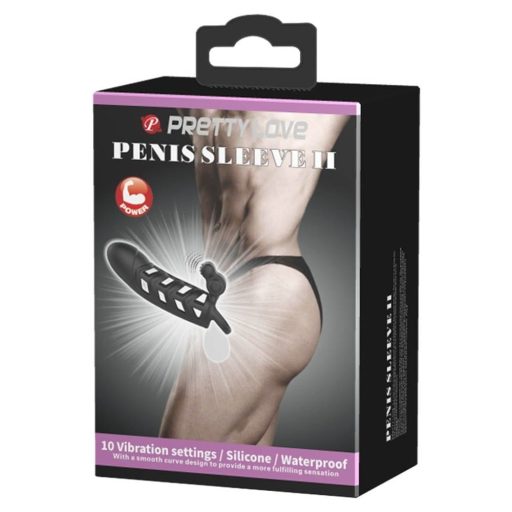 A Pretty Love Penis Sleeve II kompromisszumok nélkül turbózza fel a közös élményt: fekete, rugalmas köpenye teljes hosszában körbeöleli a péniszt, akárcsak egy extra vastag óvszer, miközben csiklóizgatóval szerelt vibrációs betétje 10 lenyűgöző ritmusban pezsdíti a partner legérzékenyebb pontjait. A beépített heregyűrű stabil tartást ad, csökkenti az elcsúszás esélyét, a 16–20 cm-es hossznak és 4,5–4,9 cm-es belső átmérőnek köszönhetően pedig változatos méretekre is könnyedén felcsúsztatható.