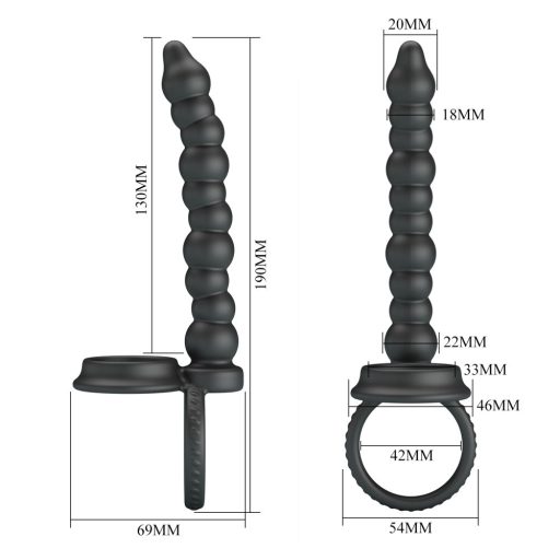 Fedezd fel a kettős kényeztetés új dimenzióját a Pretty Love Dillion péniszgyűrűvel! A selymesen sima, fekete szilikon gyűrű a pénisz tövére és a herezacskó alá simulva stabil tartást biztosít, míg a hozzá rögzített, 10 golyóból álló, 11–15 cm hosszú anális lánc mélyről érkező, hullámzó stimulációval fokozza az élményt. A 4–4,4 cm-es rugalmas átmérőnek köszönhetően szinte bármilyen mérethez igazodik, a teljesen vízálló kialakítás pedig a zuhany alatti játékot is gond nélkül lehetővé teszi.