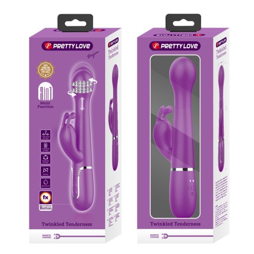 A Pretty Love Dejon Twinkled Tenderness Purple II prémium szilikonból készült, két nagy teljesítményű motorjával egyszerre kényezteti a G-pontot és a csiklót. A vibrátor 7 rezgési, 4 lökő és 3 sebességfokozata szinte végtelen kombinációt kínál, a fejben található gyöngyös mechanika pedig 4-féle rotációval masszírozza a legérzékenyebb idegvégződéseket. Nyuszi formájú külső stimulátora puhán öleli körbe a csiklót, míg a memóriafunkció elmenti a kedvenc beállításokat a következő alkalomra.