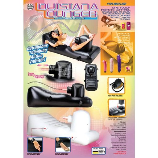 Éld át a határok nélküli gyönyört a Louisiana Lounger felfújható szexgéppel! A 160 x 80 cm-es, anatómiailag formázott, fekete pihenőágy lábrészébe rejtett lökőmechanika percenként akár 200 vad hullámmal kényeztet; az adapterre egyetlen mozdulattal illesztheted a csomagban található három vibrátor valamelyikét. A csukló- és bokapántok stabilizálnak, a vezeték nélküli távirányító pedig szabad kezet ad a tempó szabályozásához.