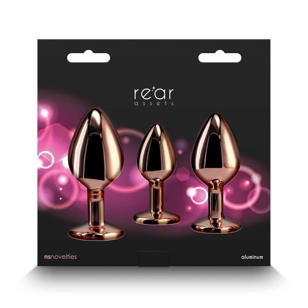 A Rear Assets – Trainer Kit Rose Gold – Pink három darabos análtréner szett, amely elegánsan csillogó, rose gold árnyalatú fémből készült. A kúpos kialakítású plugok 6, 8 és 10 cm hosszúak, átmérőjük 3–3,4 cm között fokozatosan nő, így kényelmes lépésről lépésre tágítást tesznek lehetővé. A sima, csúszós felület gyorsan felveszi a test melegét, míg a pink ékkővel díszített, biztonságos talp szemet gyönyörködtető látványt nyújt mindkét félnek.