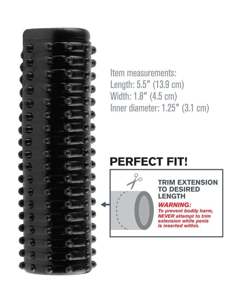 Fedezd fel a Pipedream Fantasy X-tensions Magic Pleasure Sleeve nyújtotta extra kéjes élményt! A 11–15 cm hosszú, mindkét végén nyitott, fekete péniszköpeny rugalmas TPR-ből készült, így könnyedén idomul a hímvesszőhöz vagy kedvenc vibrátorodhoz. Csőszerű kialakítása révén óvszerhez hasonlóan felgörgethető, miközben domború, stimuláló mintázata érzéki pluszt ad partnerednek. Teljesen vízálló, ezért a hálószobán kívül a zuhany alatt is bevetheted.
