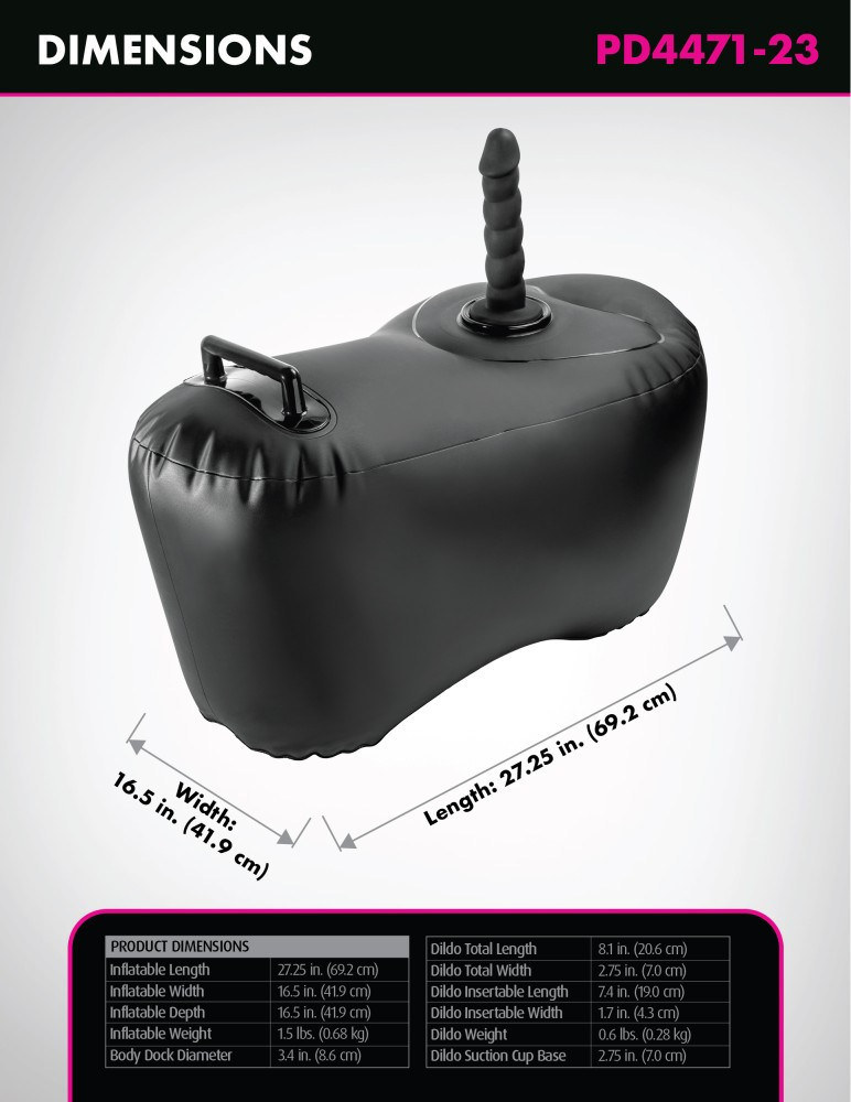Szabadítsd fel fantáziád a Body Dock Inflatable Love Seat segítségével! A felfújható, puff-szerű ülőke ergonomikus kialakítása és rugalmas felülete biztos támaszt nyújt, akár lendületes mozdulatoknál is. Közepén a szabadalmaztatott Body Dock tapadókorong várja a mellékelt, 20,6 cm hosszú és 4,3 cm átmérőjű szilikon dildót – vagy bármely, 8,4 cm-nél kisebb átmérőjű kedvenc kiegészítődet. A diszkrét, fekete design bármely hálószobába beleolvad.
