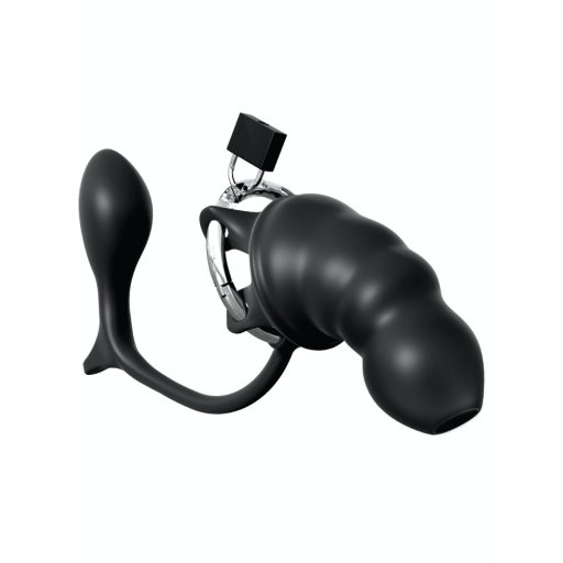 Az Ass-gasm Cock Blocker Black egyedülálló 2 az 1-ben élményt kínál: a puha, fekete szilikon péniszköpeny megbízhatóan zárja a hímvesszőt, miközben a beépített, kb. 10 cm-es análdildó a prosztatát célozza. A herék mögé simuló, három fokozatban állítható gyűrű stabilan a helyén tartja az eszközt, a mellékelt lakat pedig gondoskodik róla, hogy csak a kulcs birtokosa szabadíthassa fel. Vízálló kialakításának köszönhetően a zuhany alatti játékoknak sincs akadálya.