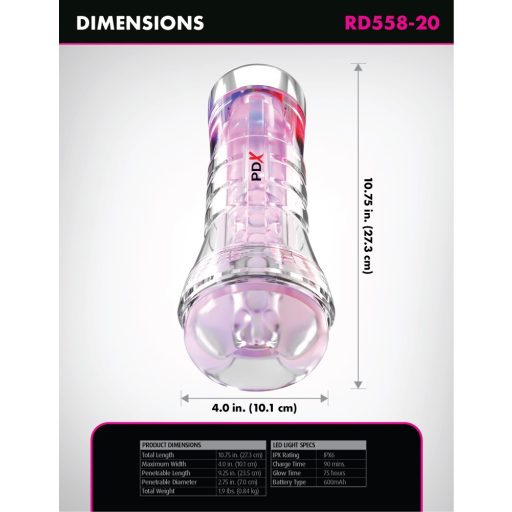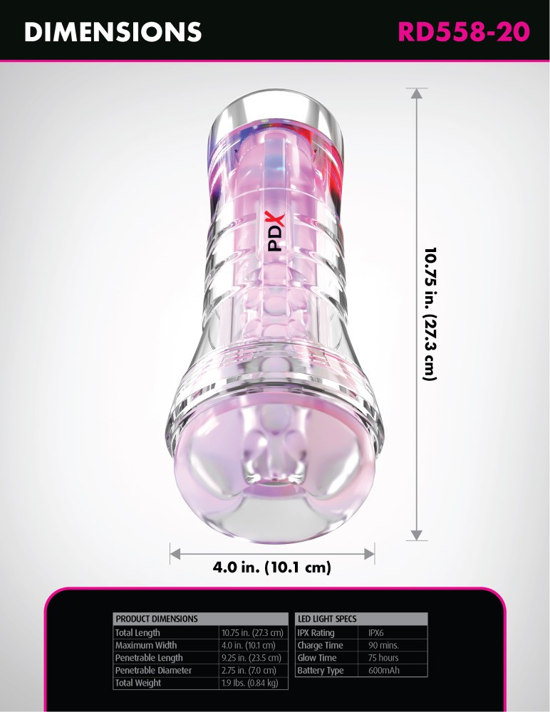 Fedezd fel a látvány és érzékek új dimenzióját a ViewTube XXL See-Thru EZ-Grip LED Strokerrel! A 26–30 cm hosszú, színtelen TPE test teljesen átlátszó, így minden mozdulatod élő show-vá válik. A beépített LED-világítás még izgalmasabbá teszi az élményt, míg a rugalmas, gömbökkel dúsított betét körkörösen stimulál. Az ergonomikus, bordázott külső markolat nedves kézzel is biztos fogást ad, a vízálló kialakítás pedig a zuhany alatti játékot is lehetővé teszi.