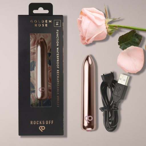 Fedezd fel a RO 90 Rechargeable bullet – Golden Rose elegáns erejét! A mindössze zsebméretű, kb. 60 grammos mini vibrátor fényesen csillogó arany testéhez selymes, bőrbarát szilikon borítás társul. Lekerekített fejével finoman simul a kényes zónákhoz, miközben a 16 különböző rezgésprogram a suttogóan lágytól a pulzálóan erőteljesig kényeztet. Teljesen vízálló, így a zuhany vagy a habos fürdő sem szabhat határt a gyönyörnek, az USB-ről újratölthető akkumulátor pedig hosszan tartó, megbízható működést garantál.