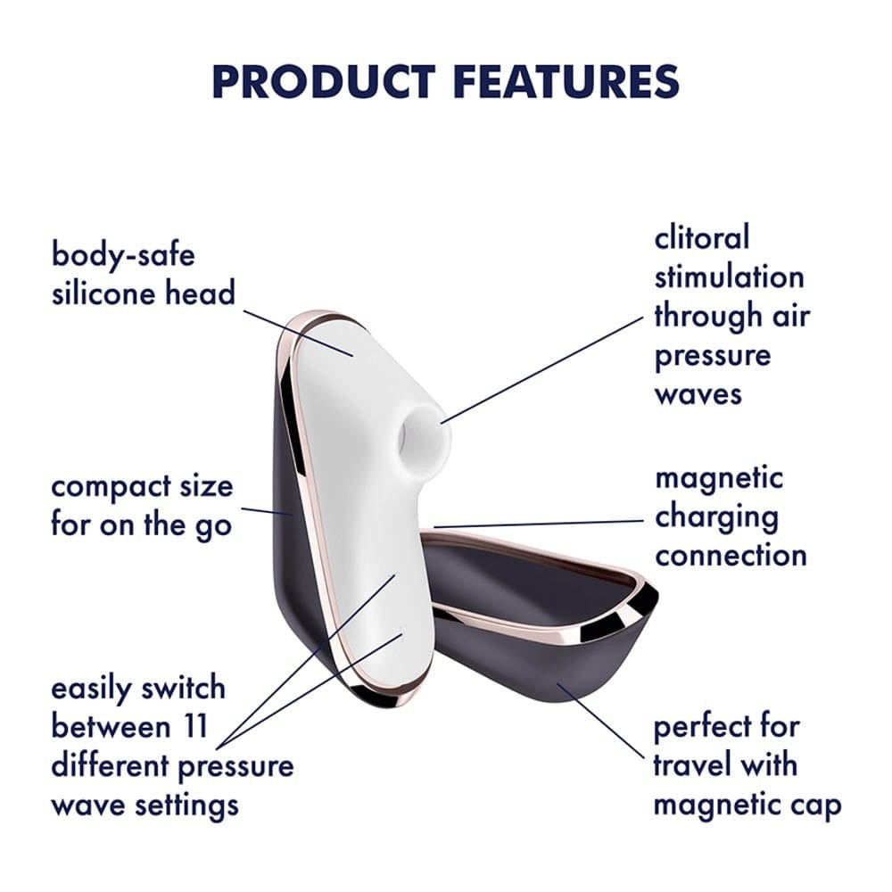 Prémium minőségű, bőrbarát anyagból készített, egyszerűen vezérelhető, 11 szívó funkcióval rendelkező léghullámos csiklóizgató, mely egy mágnessel záródó tokban helyezhető el, ennek egyik fele maga az izgató. A nevéből adódóan tényleg bárhová és bármikor elvihető.