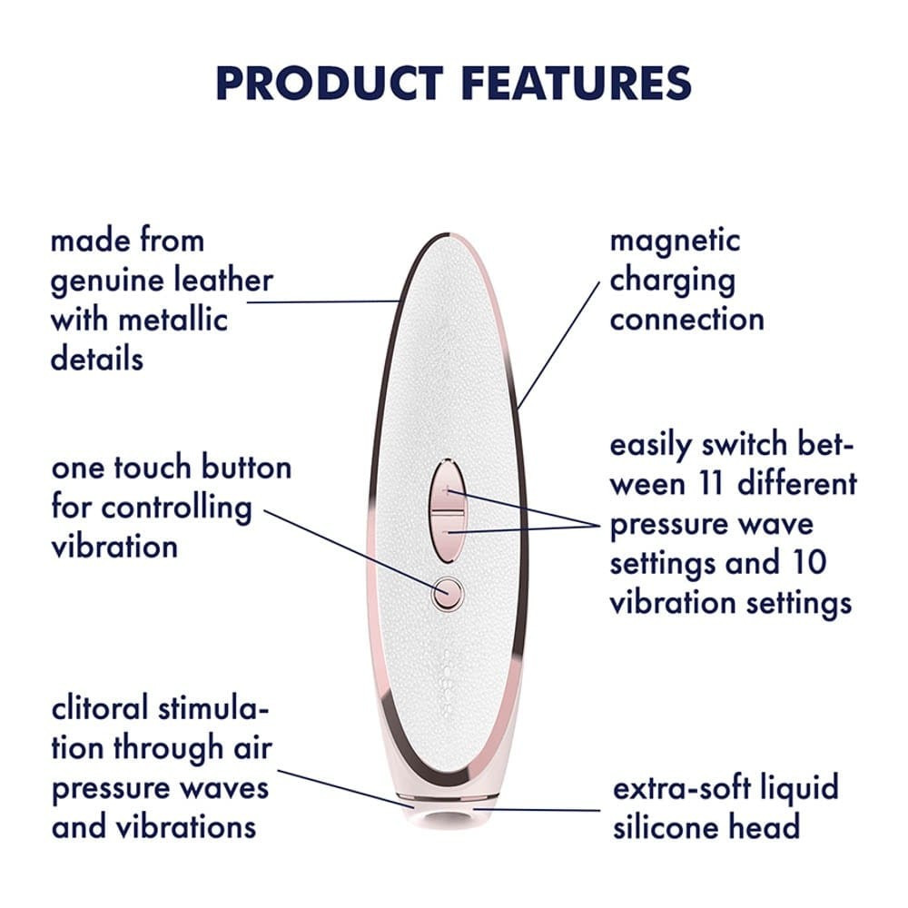 Engedd, hogy a kifinomult luxus ölelje körbe legérzékenyebb pontodat a Satisfyer Luxury Prêt-à-porter csiklóizgatóval! Valódi bőrrel bevont, rózsaszín testét selymes szilikonfej koronázza, így a csúcstechnológia és a prémium design tökéletes harmóniát alkot. Ergonomikus formája kényelmes fogást biztosít, míg a 11 léghullám-intenzitás és a 10 rezgésprogram függetlenül kapcsolható, hogy minden alkalommal személyre szabott kényeztetésben részesülj. Vízálló, újratölthető és diszkréten halk – igazi ékszer a hálószobában.