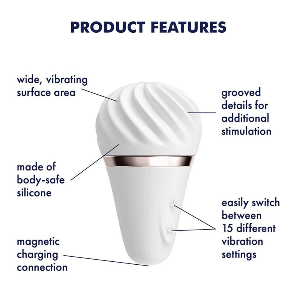 Engedd, hogy a Satisfyer Layons Sweet Sensation fagylalt formájú csiklóizgató selymesen puha szilikonfelülete és 10 változatos rezgésprogramja elragadjon! A játékos, fehér „gombóc” kompakt méretének köszönhetően diszkréten megbújik a táskádban, mégis hatékonyan kényezteti a csiklót, a mellbimbót vagy akár a heréket. Teljesen vízálló, így a zuhany alá is veled tarthat, míg a beépített akkumulátor gondoskodik a hosszú, megszakítás nélküli élvezetről.