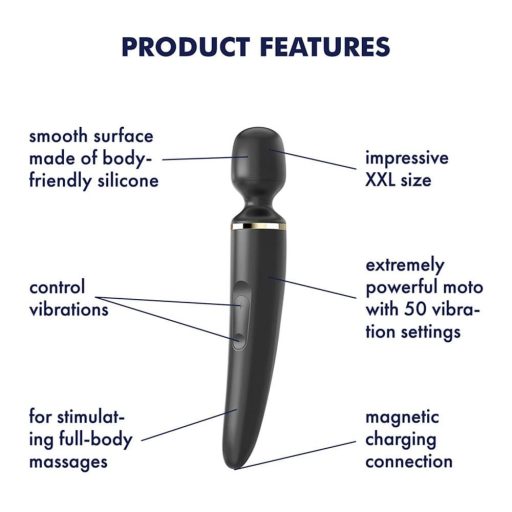 Engedd, hogy a Satisfyer Wand-er Woman black/gold luxus masszírozója hullámokban vigyen a teljes ellazulás felé! A 33,4 cm-es, impozáns méretű pálca flexibilis, selymes szilikon fejével célzottan oldja a feszültséget, legyen szó vállról, hátról vagy intim területekről. A fekete testet körülölelő arany díszítés elegáns külsőt kölcsönöz, míg az erőteljes motor 10 vibrációs programot és programonként 5 sebességet kínál – összesen 50 különböző rezgésvariációval kényeztet.