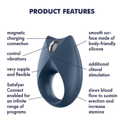 Péniszgyűrű, Satisfyer, Royal One, 6–10 cm hossz, 3–3,4 cm átmérő, kék, csiklóizgatóval, vibrációs, app-vezérelt, akkumulátoros, vízálló