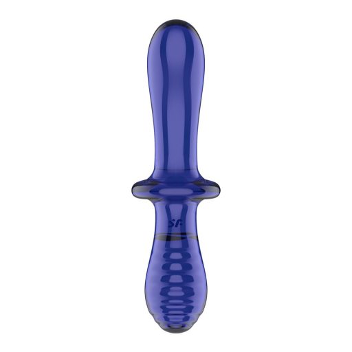 Üveg dildó, Satisfyer, Double Crystal, 19 cm, világoskék, kétvégű, boroszilikát üveg, g-pontos, bordázott és sima, hő- és hidegjátékhoz