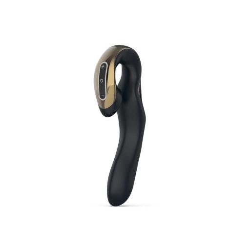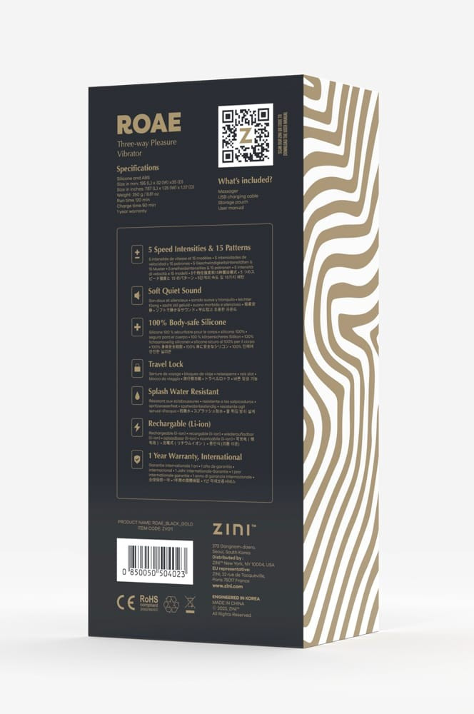 Fedezd fel a Zini Roae SE Three-way Pleasure Vibrator Black Gold luxusát! A prémium minőségű, selymes tapintású szilikonból készült, fekete-arany díszítésű kényeztető különleges kialakítással öleli körbe a csiklót, a G-pontot és az A-pontot, így egyszerre három zónát stimulál. Öt sebesség és 15 változatos rezgésprogram közül válogathatsz, hogy minden pillanat tökéletesen személyre szabott legyen. Fröccsenésálló borítása a vizes játékokat is lehetővé teszi, a beépített akkumulátor pedig vezeték nélküli szabadságot ad.
